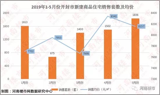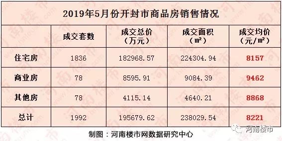 据河南楼市网数据研究中心统计分析,2019年5月份,开封市新建商品房共计销售1992套,累计成交23.80万㎡,成交金额为19.57亿元,成交均价8221元/㎡。