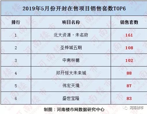 2019年5月份,开封房地产在售项目销售超过100套的共有3家,从项目销售榜单来看,北大资源·未名府、圣桦城五期、中南林樾,分别以161套、108套、102套位居前三名!